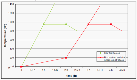 Después de su colocación en el horno el crisol debe ser calentado a una temperatura de 200C (390F) por un periodo de 2 horas. Esto asegura la eliminación de cualquier humedad que el crisol pudiera guardar.